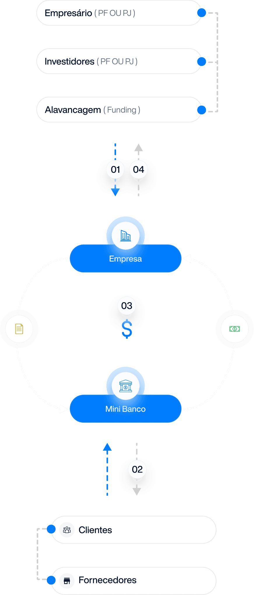 Com o capital do Mini Banco, são realizadas as operações de antecipação de recebíveis, financiamento de fornecedores e clientes via risco sacado ou nota comercial e CCB.